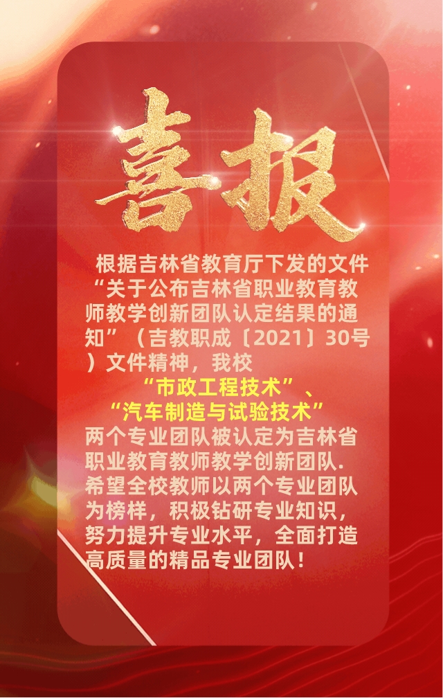 热烈祝贺我校“市政工程技术”、“汽车制造与试验技术” 两个专业团队被认定为吉林省职业教育教师教学创新团队